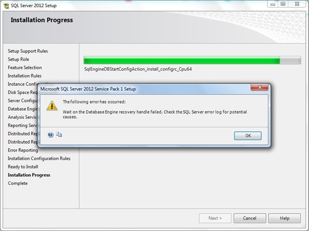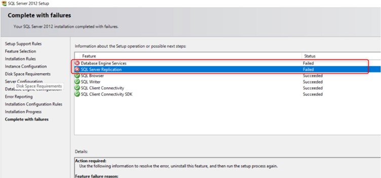 After I click ‘OK’ on the error, the installation is completed with Database Engine Services and SQL Server Replication failures. The SQL Server Service will not start. Why?