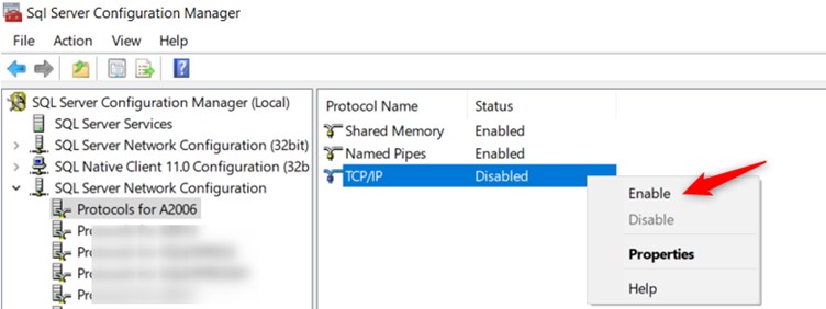 6) After that, go to SQL Server Configuration Manager, go to SQL Server Network Configuration > Protocols for A2006 (choose the instance name that you installed just now), right click on TCP/IP and select Enable.
