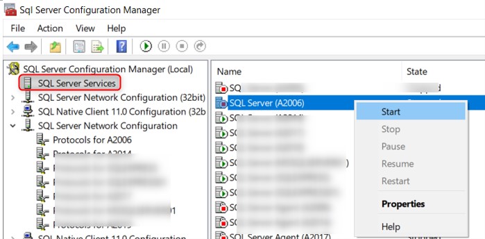 7) Go to SQL Server Services, right click on SQL Server (A2006) > Properties > Service, change the Start Mode to Automatic, then click on Apply and OK.