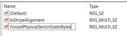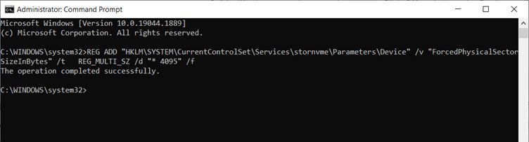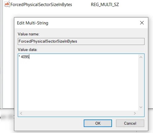 REG ADD "HKLM\SYSTEM\CurrentControlSet\Services\stornvme\Parameters\Device" /v "ForcedPhysicalSectorSizeInBytes" /t REG_MULTI_SZ /d "* 4095" /f