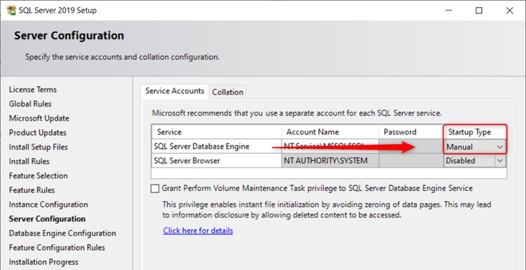 4) Under the Server Configuration page, make sure Startup Type for SQL Server Database Engine is Manual or Disabled.