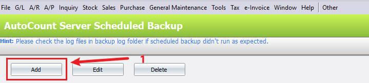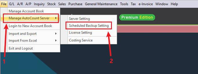 Step 1: Go to File -> Manage AutoCount Server -> Scheduled Backup Setting.