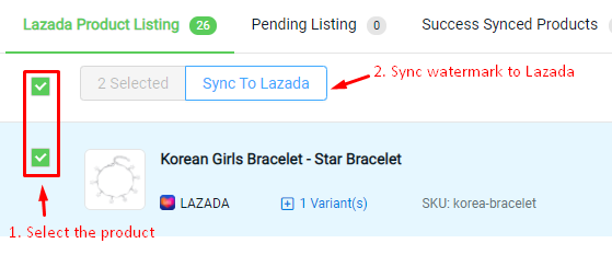 Step 8: Select the Products you would like to apply the Watermark and click on Sync to Lazada.
